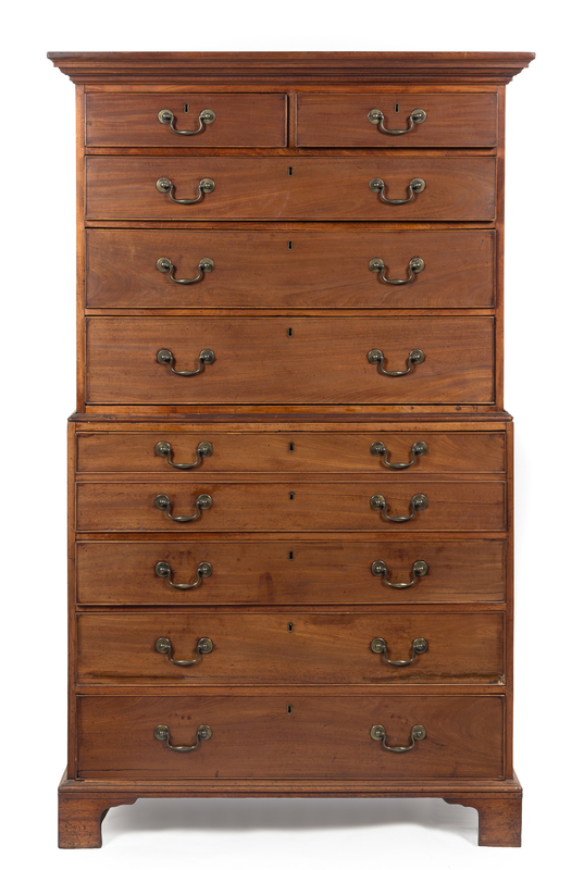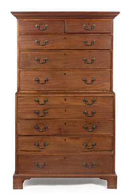 in two parts, the superstructure having a molded cornice above two short drawers and three long drawers, the base fitted with a secretary drawer over three graduated long drawers, raised on bracket feet.