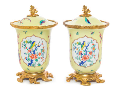 A Pair of French Gilt Bronze Mounted Porcelain Covered Jars