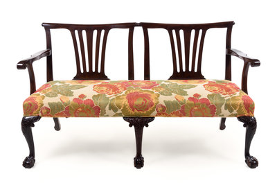 the straight crest rail above the two pierced vertical splats and stuffover seat within open arms, raised on foliate carved cabriole legs ending in claw and ball feet.