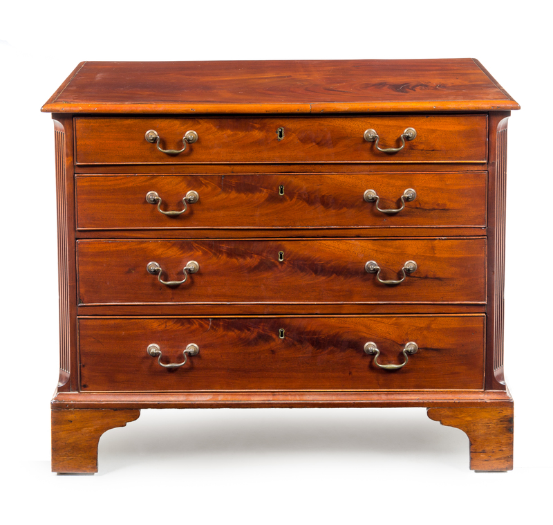 the rectangular top above four graduated long drawers flanked by fluted canted pilasters, raised on bracket feet.