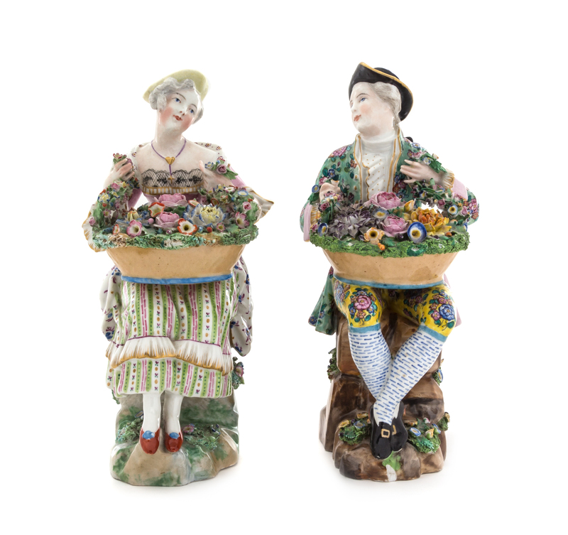 in the form of a seated gentleman and lady in 18th century attire, each with a basket of flowers resting on their lap, with a crossed swords mark in underglaze blue to the underside.
