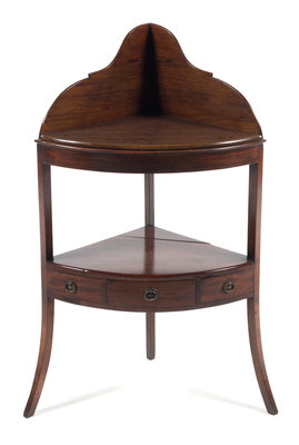 having a shaped back above two quarter-round tiers, the lower tier fitted with a drawer flanked by two faux drawers, raised on splayed legs.