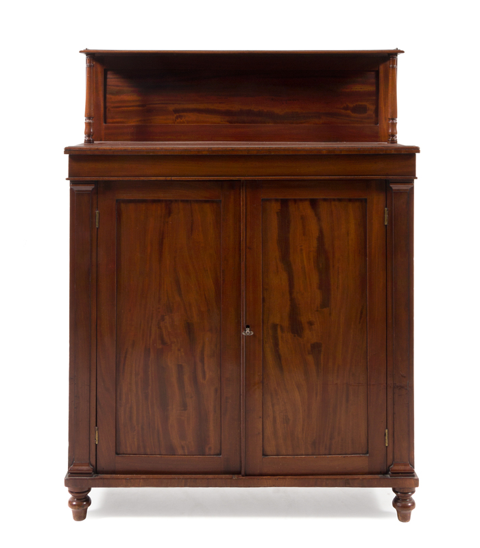 having a shelf raised on ring turned columnar supports above the rectangular top, the case fitted with two paneled doors opening to a shelved interior, raised on toupie feet.