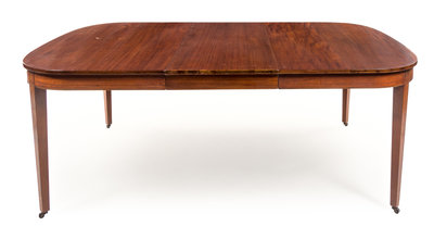the rectangular top with rounded corners raised on square tapering legs ending in casters, with three 20-inch leaves.