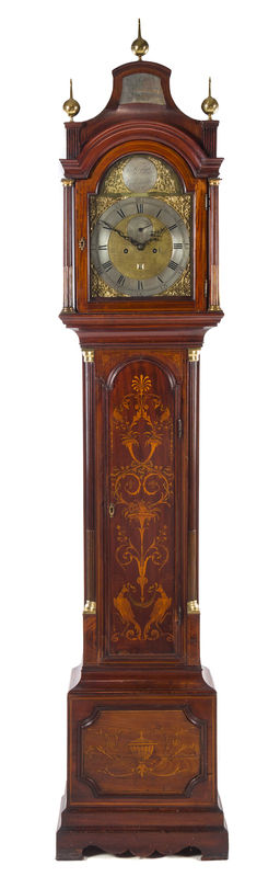the domed hood with three brass finials above the glazed door enclosing a brass dial with a silvered metal chapter ring having Roman numeral hours and Arabic numeral minutes, further set with a seconds dial and date aperture, signed Hedge Colchester, the straight case inlaid to depict phoenixes among foliate scrolls and cornucopias, all flanked by fluted columnar pilasters and raised on bracket feet.