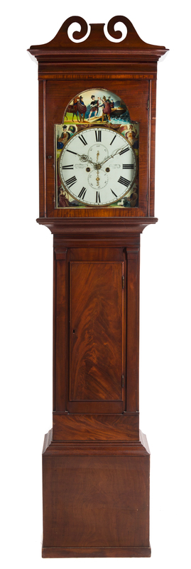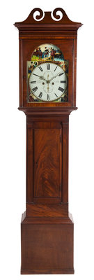 the broken swan neck pediment above the painted dial with Roman numeral hours, further set with seconds and date dials, signed John Paterson Coathridge, raised on a straight trunk fitted with a door, raised on a plinth base.