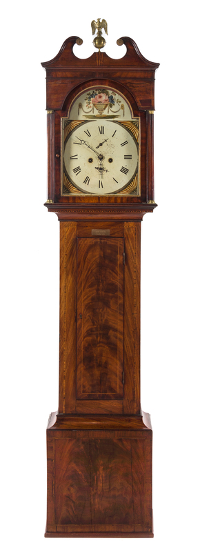 having a broken swan neck pediment centered by a brass eagle finial above the glazed door enclosing the painted iron dial with Roman numeral hours, further painted to show a flowering urn, signed with a partially obscured signature, the straight trunk fitted with a door, raised on a molded plinth base.