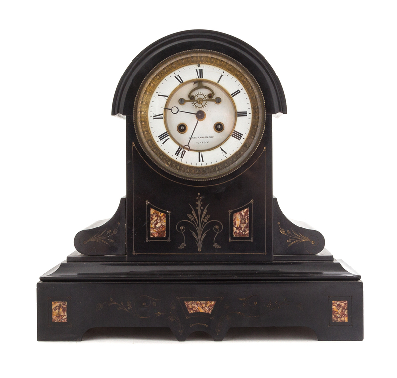 the domed case having a circular enameled dial with Roman numeral hours, signed JAMES RANKIN JUNr./ GLASGOW, with incised foliate scroll and inset stone decoration throughout, raised on a bracket base.