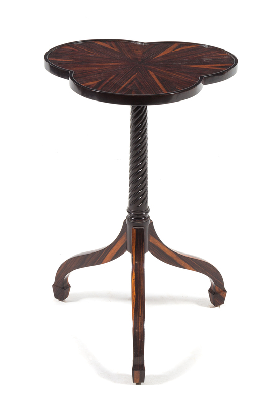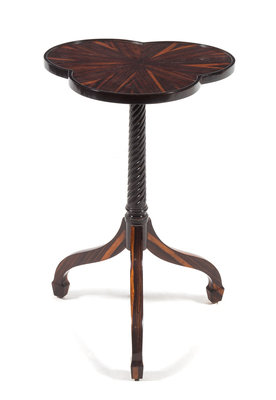 the top of trefoil form, set on a twist-fluted cylindrical tapering standard raised on a tripod base terminating in spade feet.