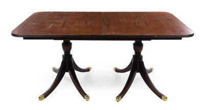 raised on twin pedestals ending in brass caps and casters, with two additional leaves and an additional pedestal.