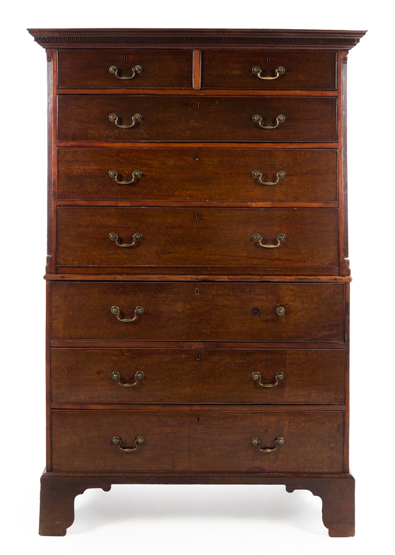 in two parts, the superstructure having a molded projecting cornice carved to show a Greek key border above two short drawers and three graduated long drawers flanked by fluted canted corners, the base fitted with a fall-front writing surface opening to a fitted interior over two long drawers, raised on bracket feet.