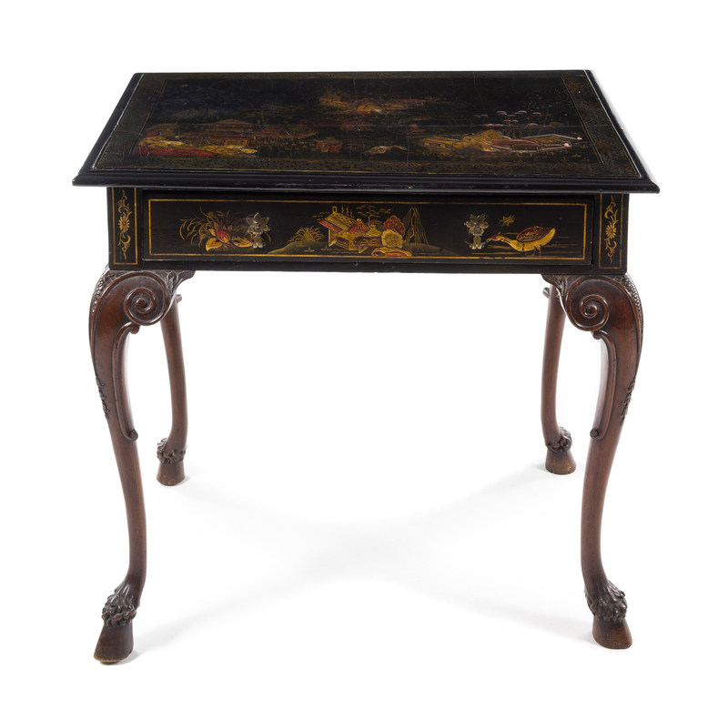 the rectangular top above the plain frieze fitted with a single long drawer, raised on carved cabriole legs ending in hoof feet, with Chinoiserie decoration throughout.