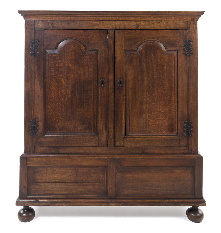 having a molded projecting cornice above two paneled doors, raised on bun feet.