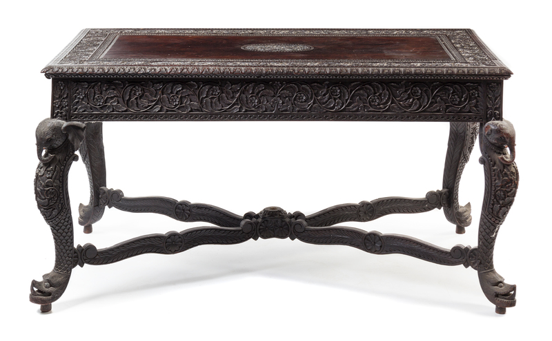 having a rectangular top heavily carved to show scrolled, flowering vines above the similarly decorated frieze, raised on four shaped legs headed by Indian elephant masks and joined by a shaped X-form stretcher carved to show rosettes.