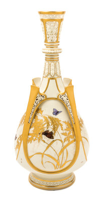 of bottle form with a pierced mouth and buttresses, having allover gilt foliate and polychrome butterfly decoration, with printed marks to the underside.