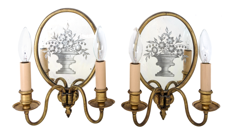 each having a mirrored oval backplate issuing the two scrolling candle arms, wired for electricity.