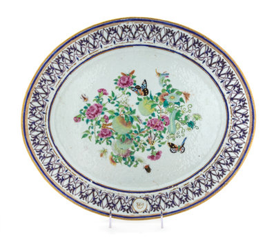 of oval form, the central reserve decorated with butterflies and insects among a floral spray of peonies and other exotic plants, within a repeating foliate border monogrammed B within a gilt circular cartouche.