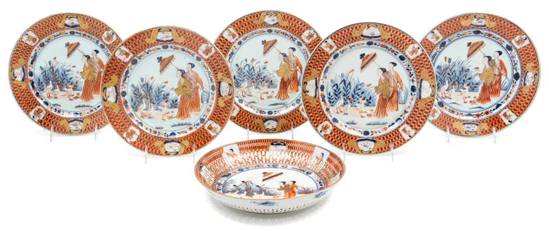 in La dame au parasol pattern in the Chinese Imari palette, comprising twelve plates and two bowls, each decorated to show a lady standing before birds while her attendant shades her with a parasol.