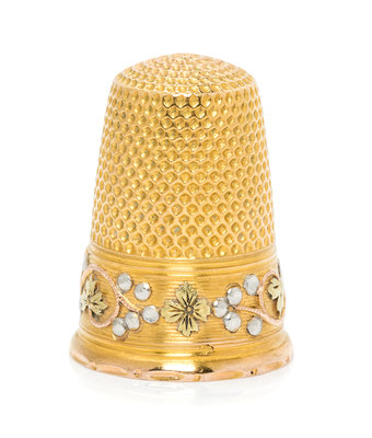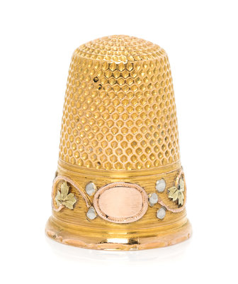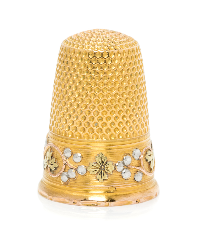 the knurled top and body above a rose, white and yellow gold band worked to show foliate and berry motifs.