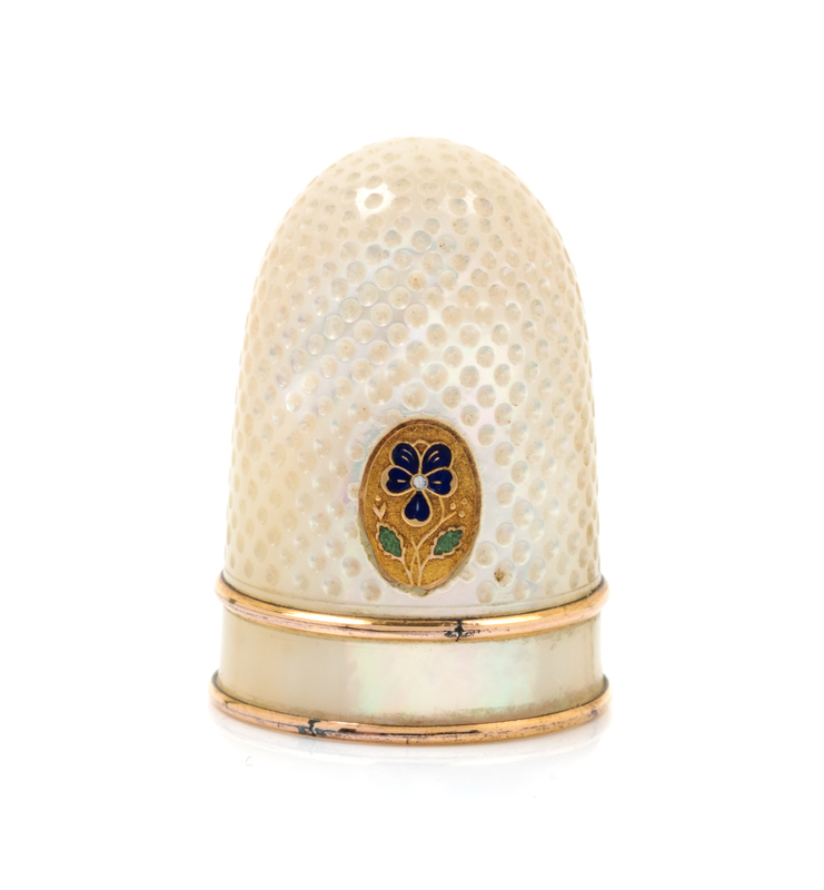 the domed body with an applied gilt metal oval plaque bearing a polychrome enamel flower above two gilt metal bands.