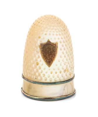 the domed body with an applied shield form gilt metal cartouche bearing an erased monogram above two gilt metal bands.