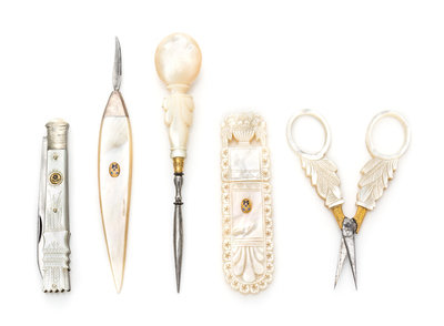A Group of Five Palais Royal Mother-of-Pearl Sewing Tools