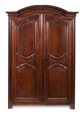 the molded domed projecting cornice above the shaped paneled doors opening to a shelved interior, raised on straight legs.