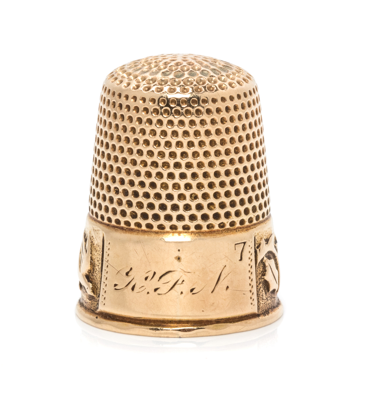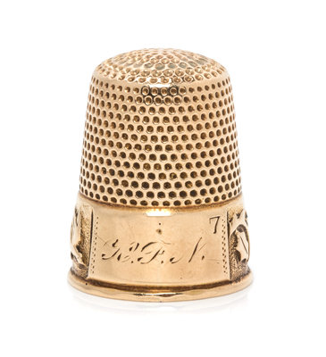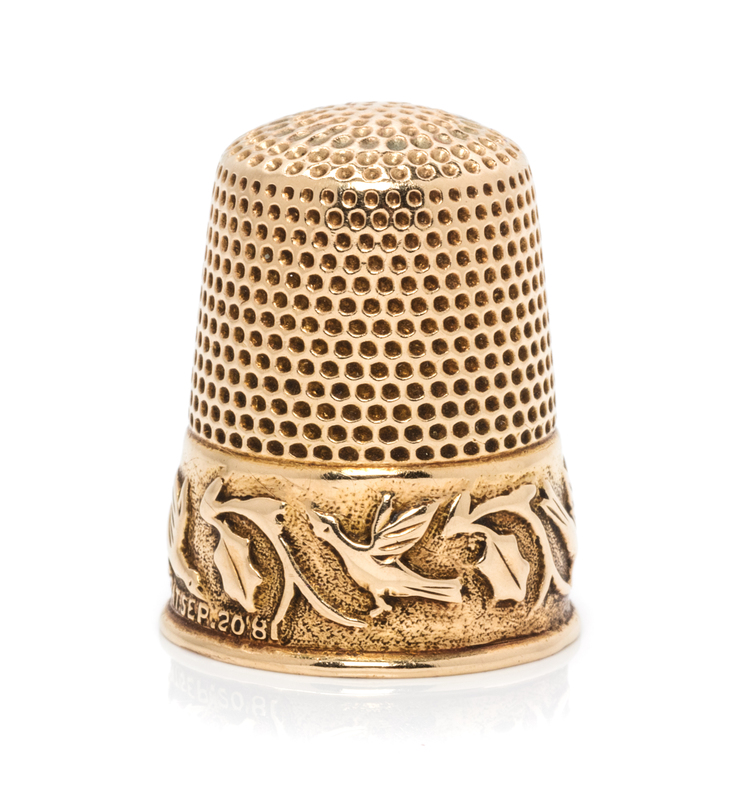 the knurled top and body above a foliate, vine and bird decorated band on a stippled ground with a monogrammed cartouche.