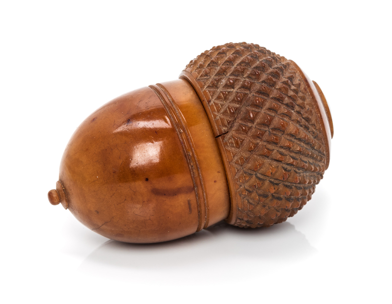 having a knurled top and body above a foliate band with an engraved cartouche within two beaded bands, size 9, together with a vegetable ivory case in the form of an acorn.
