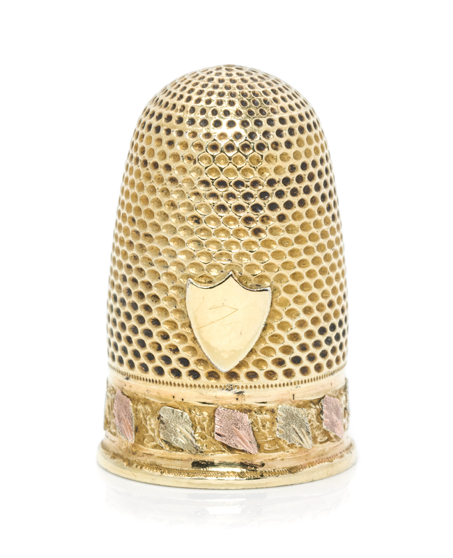 the knurled domed top and body above a rose and white gold band of continuous foliate decoration, the body with an applied vacant shield cartouche.