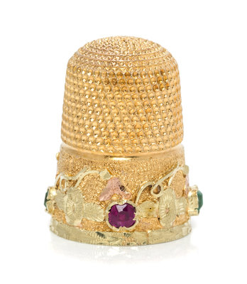 the knurled top and body above a floral and foliate band inset with two rubies and two green beryl stones.
