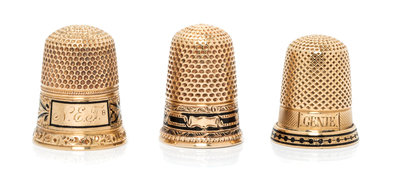 each having a knurled top and body above a black enamel band, comprising two size 6 examples and a size 8 example.
