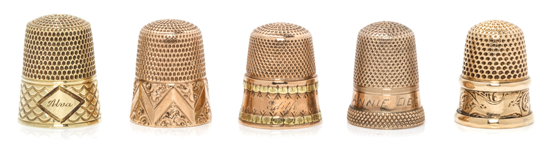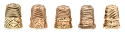 comprising an example with a bi-color gold band to the base, Stern Bros., New York, NY; an example with foliate decoration and a plain zig-zag band, Simons Bros, Philadelphia, PA, together with two unmarked examples and an unmarked child's thimble.