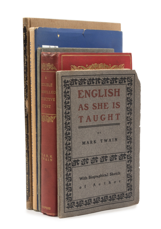 English as She is Taught. Boston: Mutual Book Company, 1900. 12mo. Original printed wrappers. FIRST AMERICAN EDITION, FIRST STATE. BAL 3465. -- A Double Barrelled Detective Story. New York: Harper and Brothers, 1902. 8vo. Illustrated. Publisher's gold-stamped red cloth, top edge gilt, others uncut. FIRST EDITION, mixed issue of the endpapers (both A and B variants, as frequently found). BAL 3471. -- Fireside Conversation in 1601 at Ye Time of Queen Elizabeth. N.p.: n.p. ("Privately Published"), 1925. 8vo. Original boards, printed label. LIMITED EDITION, an unnumbered copy of an edition of 500, number one of "The Airdale Series." -- The Letters of Quintus Curtius Snodgrass. Daddas: University Press, 1946. 8vo. Publisher's cloth, printed dust jacket. FIRST EDITION. BAL 3575. -- [AUCTION CATALOG]. Catalogue of First and other Editions of the Writings of "Mark Twain" and of Lafcaido Hearn...the Property of...Merle Johnson. New York: American Art Galleries, 1914. 8vo. Cloth. -- Together 5 volumes, condition generally good.