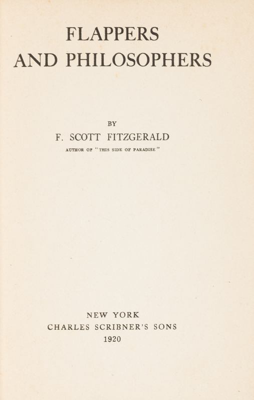 This Side of Paradise. New York: Charles Scribner's Sons, 1920. 8vo. Publisher's green cloth, spine gilt-lettered, edges uncut (some light wear, lacking dust jacket). FIRST EDITION, second printing. Bruccoli A5.1.b. -- Flappers and Philosophers. New York: Charles Scribner's Sons, 1920. 8vo. Publisher's green cloth, spine gilt-lettered, edges uncut (some light wear or stains, lacking dust jacket). FIRST EDITION, first printing. Bruccoli A6.1.a. -- The Bodley Head Scott Fitzgerald. London: Bodley Head, 1959-1963. 5 volumes (of 6, lacking vol.I) 8vo. Publisher's cloth, original printed dust jackets (spines browning, some light wear). -- Together, 3 works in 7 volumes.