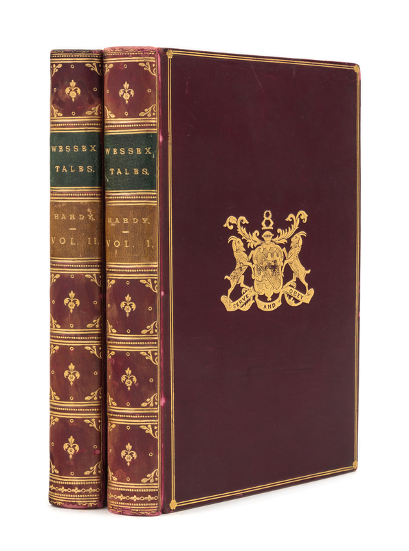 Wessex Tales. Strange, Lively and Commonplace. London and New York: MacMillan and Co., 1888. 2 volumes, 12mo (172 x 111 mm). Half-titles. (Lacking publisher's advertisements, hinge starting.) Contemporary full calf, gilt-stamped pictorial upper cover, spine in 6 compartments with 5 raised bands, gilt (boards worn with associated minor losses, joints rubbed). FIRST EDITION.[With:]The Dynasts... London: MacMillian and Co., Limited, 1927. 3 volumes, 4to (270 x 190 mm). Frontispiece portrait after Francis Dodd signed by the artist in pencil, printed in red and black. Original quarter vellum and printed boards, yapp edges (small areas of paper lifting near edges). LIMITED TO 525 COPIES SIGNED BY HARDY. "An epic-drama of the war with Napoleon, in three parts, nineteen acts and one hundred and thirty scenes, which the time covered by the works being 10 years.