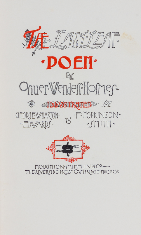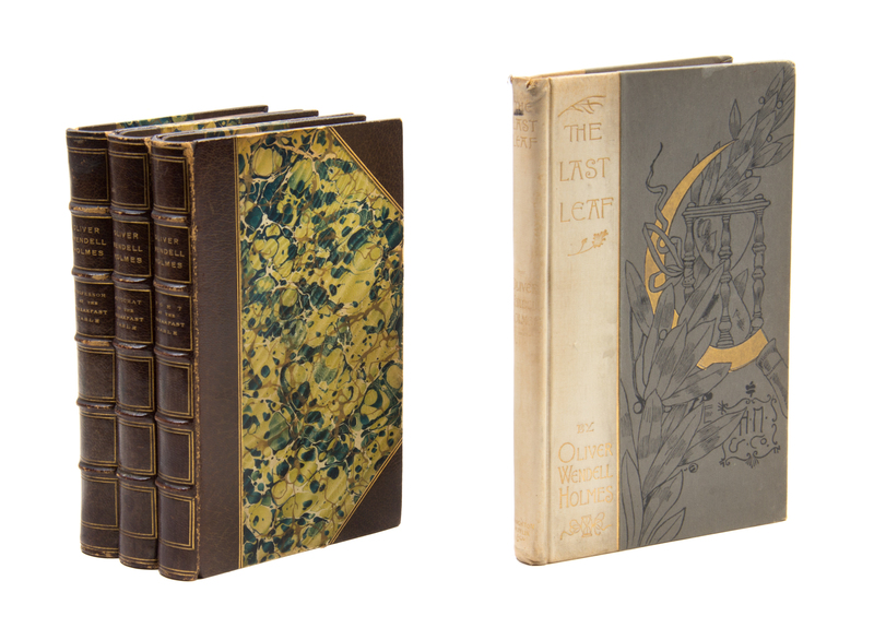 The Autocrat of the Breakfast-Table. -- The Poet at the Breakfast-Table. -- The Professor at the Breakfast-Table. London: Walter Scott Limited, n.d. 3 volumes, 12mo. Frontispieces. Uniformly bound in brown half morocco gilt, marbled boards, top edge gilt. [With:] The Last Leaf. Cambridge: Houghton, Mifflin, 1895. Title printed in red and black, numerous illustrations. Publisher's decorated gray and cream cloth. -- Together, 3 works in 3 volumes.