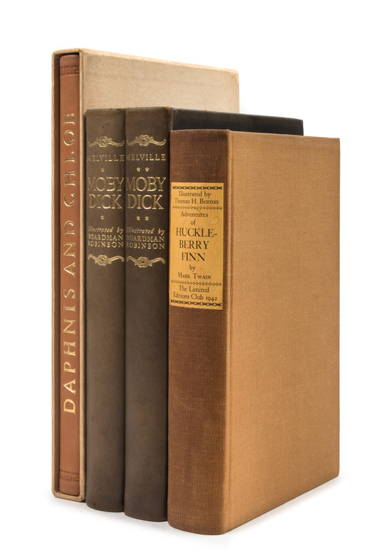 CLEMENS, Samuel ("Mark Twain"). Adventures of Huckleberry Finn [Tom Sawyer's Companion]. New York: The Limited Editions Club, 1942. Publisher's tan cloth, yellow lettering-piece on spine. -- LONGUS, The Pastoral Loves of Daphnis and Chloe. New York: The Limited Editions Club, 1934. Original sheep, the upper cover with gilt embossed medallion, gilt-lettered spine, top edges gilt, others uncut, original slipcase. -- MELVILLE, Herman. Moby Dick; or, The Whale. [New York]: The Limited Editions Club, 1943. Publisher's black leather, gilt-lettered spine. -- Together 3 works in 4 volumes, 4to and 8vo, condition generally fine.