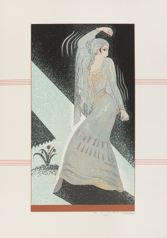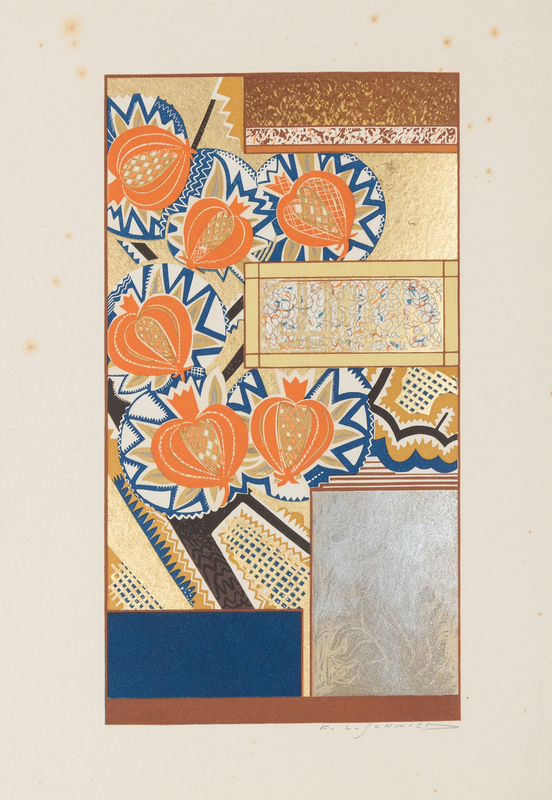 4to (244 x 194 mm). Title printed in red and black, pages ruled in red. 37 color wood engravings including 15 elaborately decorated initials in text by F.-L. Schmied (some minor foxing to a few pages). Contemporary art deco binding of brown morocco stamp-signed JEAN LAMBERT, likely after a design by Schmied, covers decorated with horizontal lines of gilt fillets, and gilt dots, central rectangular panel made up of green vertical lines and brown horizontal morocco inlaid bands around wavy lines of red and green morocco inlays, silked linings and calf doublures, original wrappers bound in; smooth spine ruled and lettered in gilt, gilt edges (tiny chip to upper joint); board morocco tipped slipcase (slight cracking to edges). LIMITED EDITION number 77 of 100 copies from a total edition of 140, signed by F.L. Schmied on limitation page.