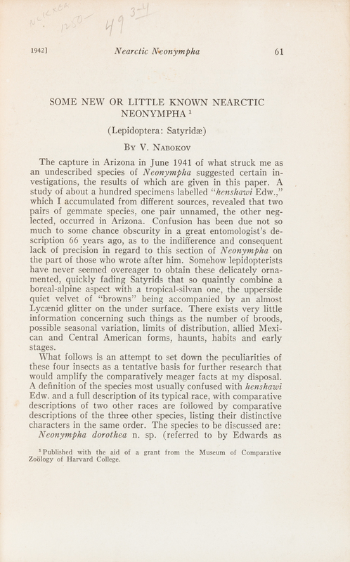 NABOKOV, Vladimir (1899-1977). "Some New or Little Known Nearctic Neonympha." Offprint from: Psyche, Vol.XLIX, Nos.3-4 (1942).