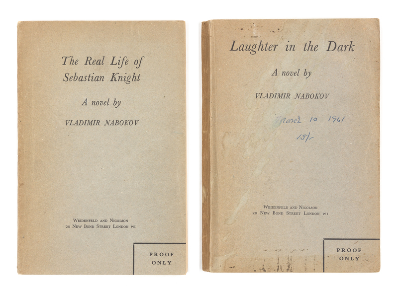 The Real Life of Sebastian Knight. London: Weidenfeld and Nicolson, 1960. 8vo 192 x 131 mm). Original drab printed wrappers, labeled "Proof Copy" on upper cover. See Juliar A14.6. (1st British edition).Laughter in the Dark. London: Weidenfeld and Nicolson, 1961. 8vo (195 x 131 mm). Original drab printed wrappers, labeled "Proof copy" on upper cover (spine leaned, a few notes or stains). See Juliar A21.4 (New British edition). [With:] A copy of the book. Original cloth, original dust jacket.