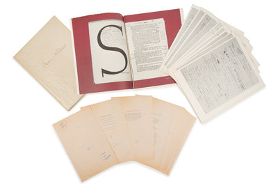 Lectures on Ulysses. Bloomfield Hills, MI: Bruccoli Clark, 1980. Set of 10 signatures, 4to; typed publisher's review slip. A facsimile of the first two pages of Nabokov's teaching copy of Ulysses, and facsimiles of his lecture notes, published in an edition of 500 copies. [With:] A copy of the book. 4to. Original linen, original glassine. Carrousel: Laughter and Dreams, Painted Wood, The Russian Song. Aartswoud, Netherlands: Spectatorpers, 1987. 24 leaves printed recto only, 8vo. Corrected in hand of Dmitri Nabokov with a few copy editor's marks. This collection of three works was originally published as a brochure in 1923; this edition, edited by Nabokov's son, was the first reissue after that printing, published in a limited edition of 150 copies.