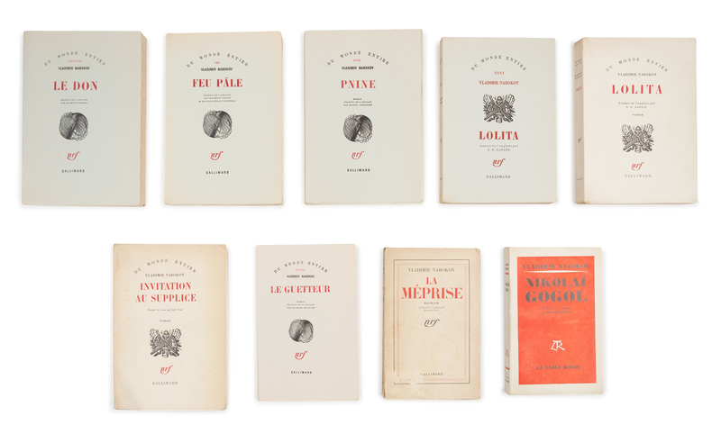 La Mprise. [Despair]. Paris: Gallimard, 1939. First French edition. Juliar D15.1. - Nikolai Gogol. Paris: La Table Ronde, [1953?]. Stamped "S.P." on lower cover. See Juliar D22.1. - Lolita. Paris: Gallimard, 1959. FIRST FRENCH EDITION, LIMITED EDITION, number 37 of 80 copies on Lafuma-Navarre. Juliar D28.7. - A second copy. - Invitation au Supplice. [Invitation to a Beheading]. Paris: Gallimard, 1960. FIRST FRENCH EDITION. Juliar 16.1. - Feu Ple. Paris: Gallimard, 1962. FIRST FRENCH EDITION, LIMITED EDITION, number 17 of 37 copies printed on Lafuma-Navarre. Juliar D35.1. - Pnine. Paris: Gallimard, 1962. FIRST FRENCH EDITION, LIMITED EDITION, number 21 of 56 copies on Lafuma-Navarre. Juliar D30.7. - Le Don. [The Gift]. Paris: Gaillimard, 1967. FIRST FRENCH EDITION, LIMITED EDITION, number 22 of 36 copies printed on Lafuma-Navarre. - Le Guetteur. [The Eye]. Paris: Gaillimard, 1968. FIRST FRENCH EDITION, LIMITED EDITION, number 25 of 36 copies printed on Lafuma-Navarre. - Together, 9 volumes, condition generally good.