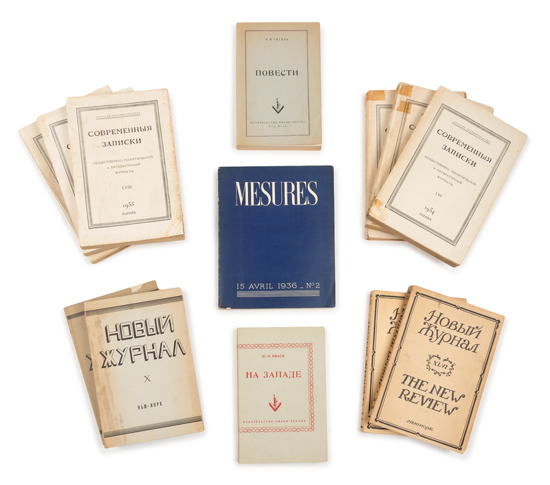 Otchaianie. ["Despair"]. In: Sovremennye Zapiski. Nos. 54-56. February, May, and October, 1934. Juliar C382, C387, C390. Quarter morocco folding case. FIRST APPEARANCE. EXCEEDINGLY RARE.[With:]Priglashenie na kazn'. ["Invitation to a Beheading"]. In: Sovremennye Zapiski. Nos. 58-60. June and November, 1935, March 1936. Juliar C393, C396, C398. Cloth folding case. EXCEEDINGLY RARE. [With:]Novyi Zhurnal. 4 issues: No.10. New York, 1945. Juliar C492. -- No.15. New York, 1947. Juliar C502. -- No.46. New York: 1956. Juliar C546-552. -- No.49. New York, 1957. Juliar C556. [And with:] "Mademoiselle O." In: Mesures. Vol.2, No.2. Paris: 15 April 1936. Juliar C399. RARE. -- Povesti. [Tales]. New York: Chekhov Publishing House, 1952. Essay in Russian by Vladimir Nabokov-Sirin, pp.i-vii. Juliar B18.1. -- "Na Zapade." In: Anthology for Russian Emigre Poetry." New York: Chekhov Publishing House, 1953. -- Together 13 volumes, 8vo, original printed wrappers.