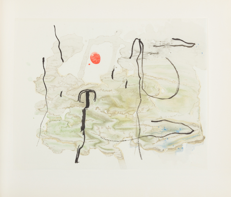Oblong folio (290 x 350 mm). Double-page color offset lithographic frontispiece on onionskin, 14 color offset lithographs by Miro printed on onionskin tipped in. (One onion skin corner creased, otherwise fine.) ORIGINAL LITHOGRAPHIC COVER BY MIRO. Trade edition, unnumbered and unsigned, without original lithograph. A fine copy.