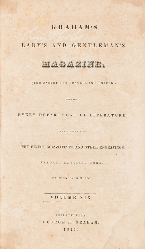POE, Edgar Allan 1809-1849). 5 contributions in: Graham's Lady's and Gentleman's Magazine. Volume XIX. Philadelphia: George R. Graham, 1841.