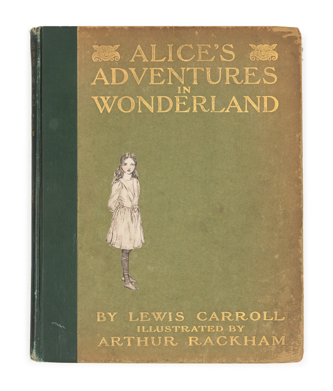 Folio (284 x 223 mm). 13 color plates mounted on heavy brown paper, printed tissue guards, numerous in-text black and white drawings. (Minor spotting.) Publisher's deep green buckram-backed boards, upper cover and spine gilt-lettered, illustration of Alice affixed to upper cover, top edge gilt, others uncut, pictorial endpapers (hinge starting, boards faded and worn, chipping to spine). LIMITED EDITION, number 537 of 550 copies printed to be sold in America. First Rackham edition.