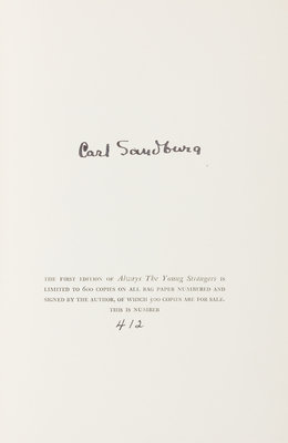 8vo. Title printed in blue and black. Publisher's blue cloth, printed spine label, top edge blue, others uncut. LIMTED EDITION, number 412 of 600 copies SIGNED BY SANDBURG.