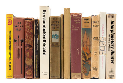 BARNES, Arthur K. Interplanetary Hunter. New York: Gnome Press, 1956. FIRST EDITION. -- DICK, Philip K. Ubik. Garden City, NY: Doubleday & Company, Inc., 1969. FIRST EDITION. -- DUNSANY, Lord. Tales of War. Dublin and London: Talbot Press and T. Fisher Unwin, 1918. FIRST EDITION. -- HUBBARD, L. Ron. Slaves of Sleep. Chicago: Shasta Publishers, 1948. FIRST EDITION. -- KELLER, David H. The Devil and the Doctor. New York: Simon and Schuster, 1940. INSCRIBED BY KELLER. -- LESLIE, Shane. A Ghost in the Isle of Wight. London: Elkins Mathews & Mariot, 1929. LIMITED EDITION, number 76 of 530 copies SIGNED BY LESLIE. -- MORA, Jo. A Log of the Spanish Main. San Francisco: Jo Mora, 1933. -- OSBOURNE, Lloyd. The Queen Versus Billy and Other Stories. New York: Charles Scribner's Sons, 1900. Publisher's cloth. -- SLADEK, John T. The Reproductive System. London: Victor Gollancz, 1968. -- SUTPHEN, Van Tassel. The Doomsman. New York and London: Harper & Brothers, 1906. Publisher's cloth. -- VERNE, Jules. Adventures in the Land of the Behemoth. Boston: Henry L. Shepard & Co., 1874. Publisher's cloth. -- Amazing Stories. Vol.40, No.5. April 1966. Original wrappers. -- The Storm Before the Calm. Chicago: Playboy Press, 1972. -- Together, 13 volumes, 8vo, publisher's cloth, dust jacket (except where indicated), condition generally fine.