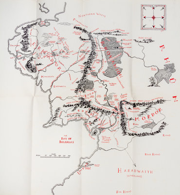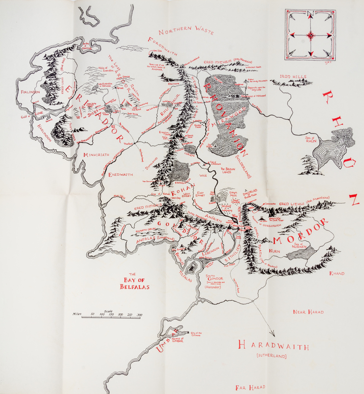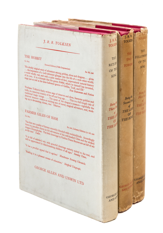 The Fellowship of the Ring. London: George Allen & Unwin, 1954. 8vo (220 x 140 mm). Folding map and full-page map printed in red and black after Christopher Tolkien, line illustrations after J.R.R. Tolkien. (Some light browning.) Publisher's red cloth, spine gold-lettered, top edge red, publisher's unpriceclipped dust jacket printed in red, black, and gold (split at front flap, back spine panel mostly split, closed tears to center of spine, a few other chips and tears to extremities, spine panel browned). FIRST EDITION, FIRST ISSUE.The Two Towers. London: George Allen & Unwin, 1954. 8vo (221 x 146 mm). Folding map printed in red and black after Christopher Tolkien. (Some minor browning.) Publisher's red cloth, spine gold-lettered, top edge red, publisher's unpriceclipped dust jacket printed in red, black, and gold (some light chipping to spine ends and corners with nominal losses, spine and edges browned). FIRST EDITION FIRST ISSUE. The Return of the King. London: George Allen & Unwin, 1955. 8vo (220 x 140 mm). Folding map printed in red and black after Christopher Tolkien. (Some minor browning.) Publisher's red cloth, spine gold-lettered, top edge red, publisher's dust jacket printed in red, black, and gold (some very minor chipping or a few short tears to head and foot of jacket, spine very slightly browned, price clipped). FIRST EDITION, FIRST ISSUE (with unbroken text on p.49 and no signature mark, jacket in the first state without quotes on rear flap).[With:] NOEL, RUTH. The Mythology of Middle-Earth. Boston: Houghton Mifflin Company, 1977. -- MIESEL, SANDRA. Myth, Symbol and Religion in the Lord of the Rings. N.p.: T-K Graphics, 1973.